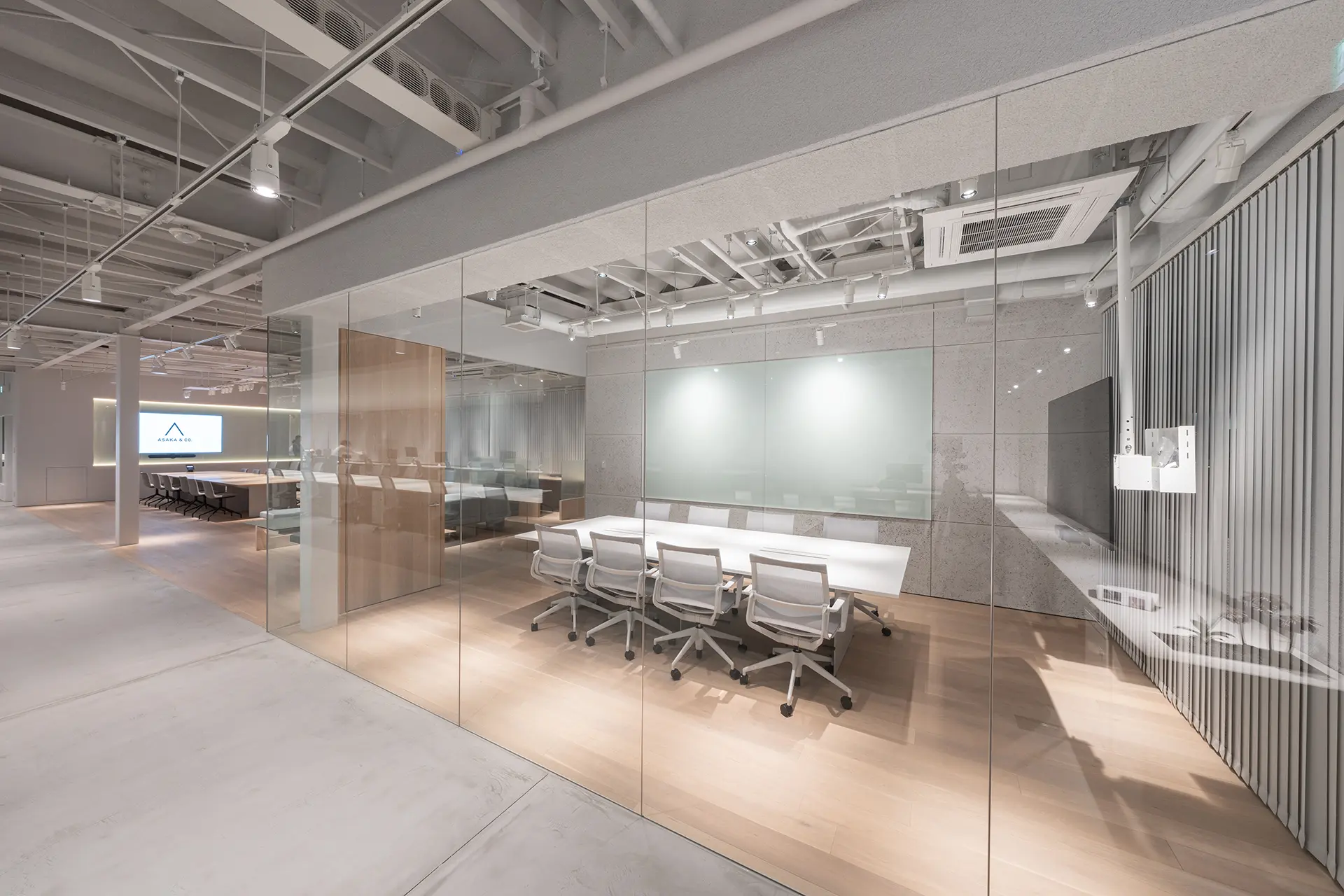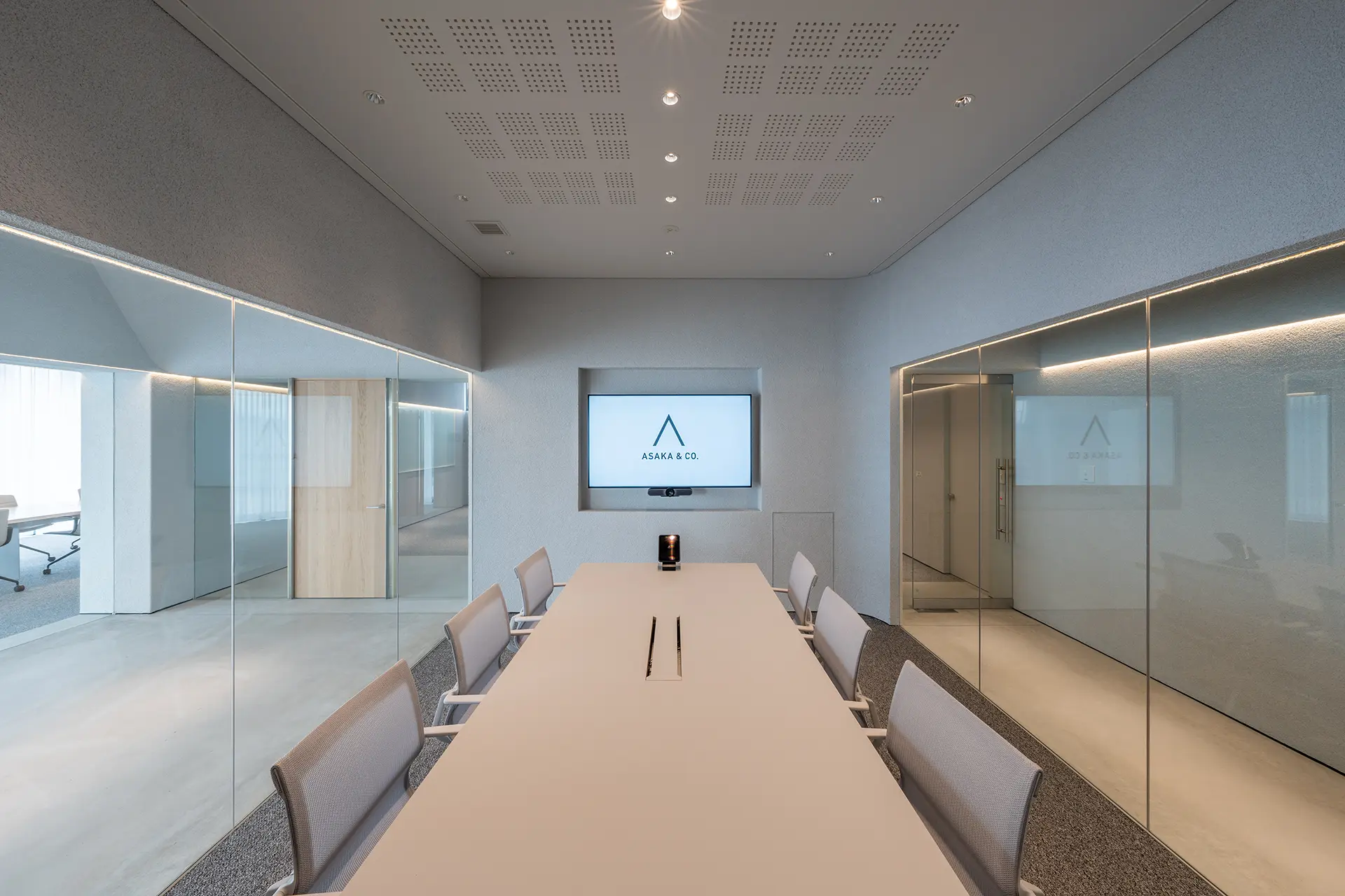 ガラスに囲まれた開放感と、集中できる⾳環境を両⽴したゲスト⽤会議室。