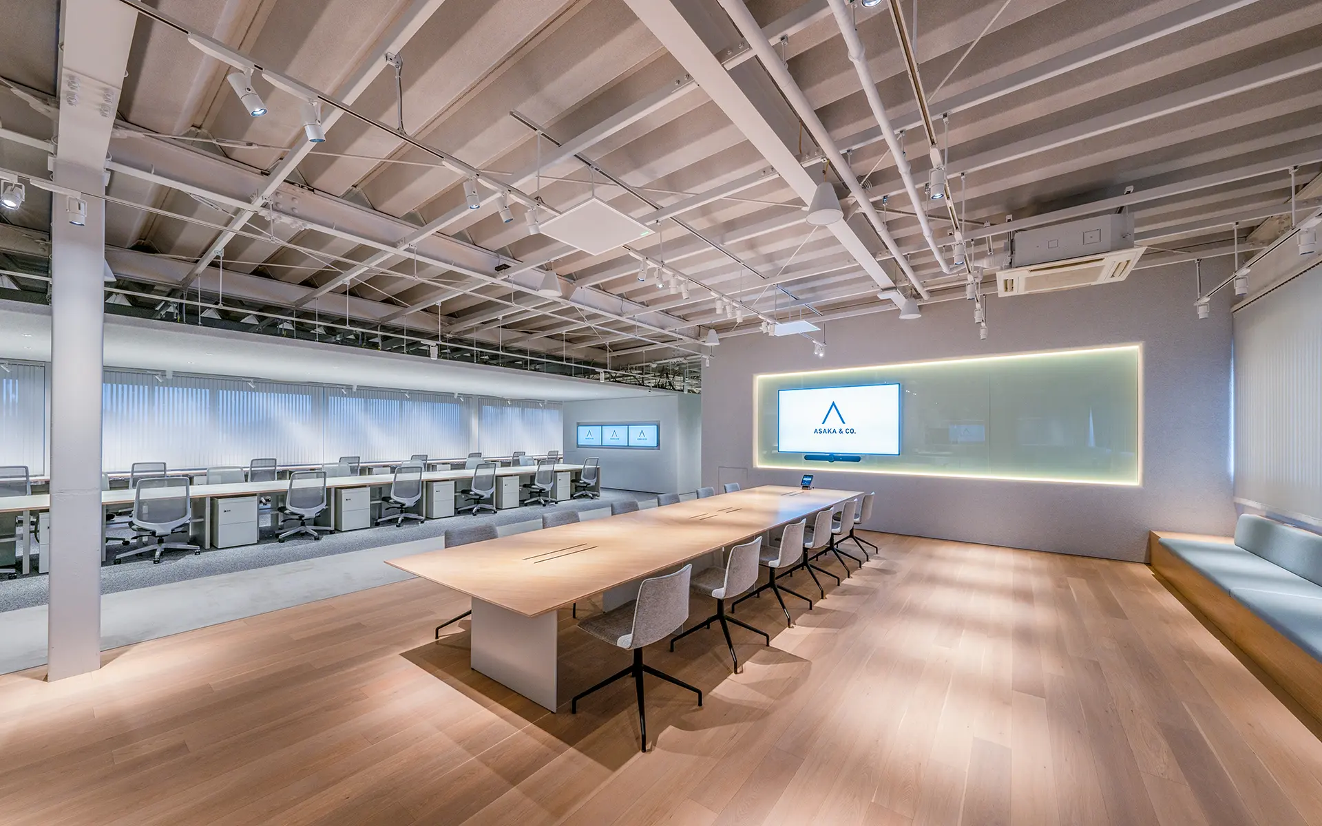 オープンな空間でありながら、拠点間をつないだ朝礼やグループミーティングにも対応し、 ⽇常のコミュニケーションと会議利⽤を両⽴する多⽬的なラウンジです。