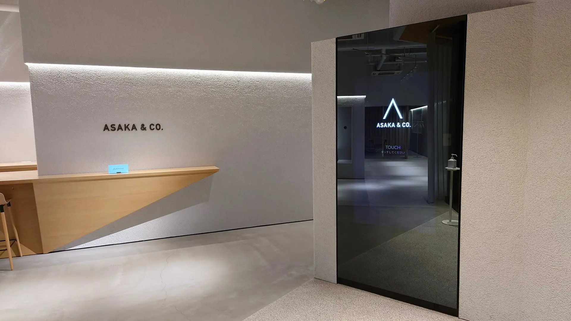 ミラーガラス⼀体型のタッチパネル端末。受付操作とデザイン性を両⽴し、洗練された第⼀印象を演出。